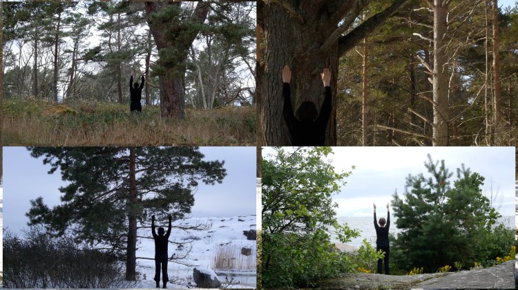 As part of the event Seven of Seven organised by Myymälä2 gallery, (see program) I will perform “Practicing with Pines” on 26. April there. Probably the performance should be called “Practicing with Pines Indoors” or “Practicing with Images of Pines” because I will perform with video compilations, that I have made for the occasion, such as “Practicing with Pines (writing)”, see video still above, “Practicing with Pines” and “Practicing with Pines (brief)”, see video stills below. The two latter ones are based on the same material of repeating the two-legged tree pose with various pine trees in 2020 and 2021. My plan is to have two parts, the first is a section where I perform actions with the projections, and then in the second part I invite the audience to try the actions themselves, and to document each other, too. I hope to gather some of the documentations on a page on the RC, here.
