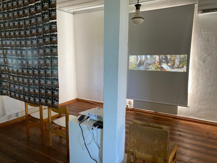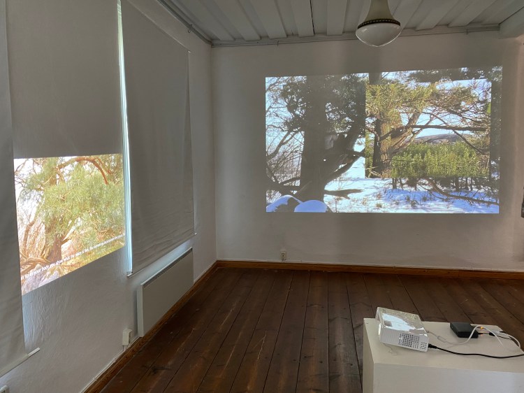 Tilassa oikealla, verhon toisella puolella on kokoelma videoita, joissa esiinnyn mäntyjen kanssa Örön saarella vuosina 2020 ja 2020 luettelossa aakkosjärjestyksessä eräänlaista “tarvenäytöstä” varten. Tosiasiassa ja käytännössä koko valikoima pyörii toistuvasti, ilmeisesti tuntien ajan,