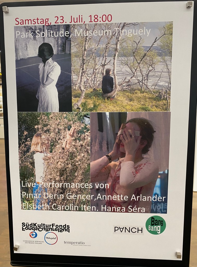Lauantaina 23 heinäkuuta minulla oli tilaisuus esittää pieni performanssi “Pondering in the Park” Baselissa, Sveitsissä Hanga Séran ja Elsbeth Caroline Itenin kutsumana. He järjestivät tapahtuman nimeltä Performance as Research näyttelyn Bang Bang – translocal histories of performance art yhteydessä Tinguely museossa. Se liittyi teemaan sosiaalinen eleganssi, joka oli yksi laajan, museon puistossa järjestetyn oheisohjelman teemoista. Lauantaina Pinar Derin Gencer, Elsbeth Carolin Iten, Hanga Séra ja minä esitimme performanssit. Sunnuntaina oli paneelikeskustelu jossa olivat mukana myös Malgorzata Sady, Pawel Korbus ja Ewa Zarzycka Puolasta. Fokus oli performanssitaiteessa ennemmin kuin esityksessä tutkimuksena (performance as research). Lisätietoja näyttelystä ja ohjelmasta, joka jatkuu 21.8. asti löytyy täältä.
