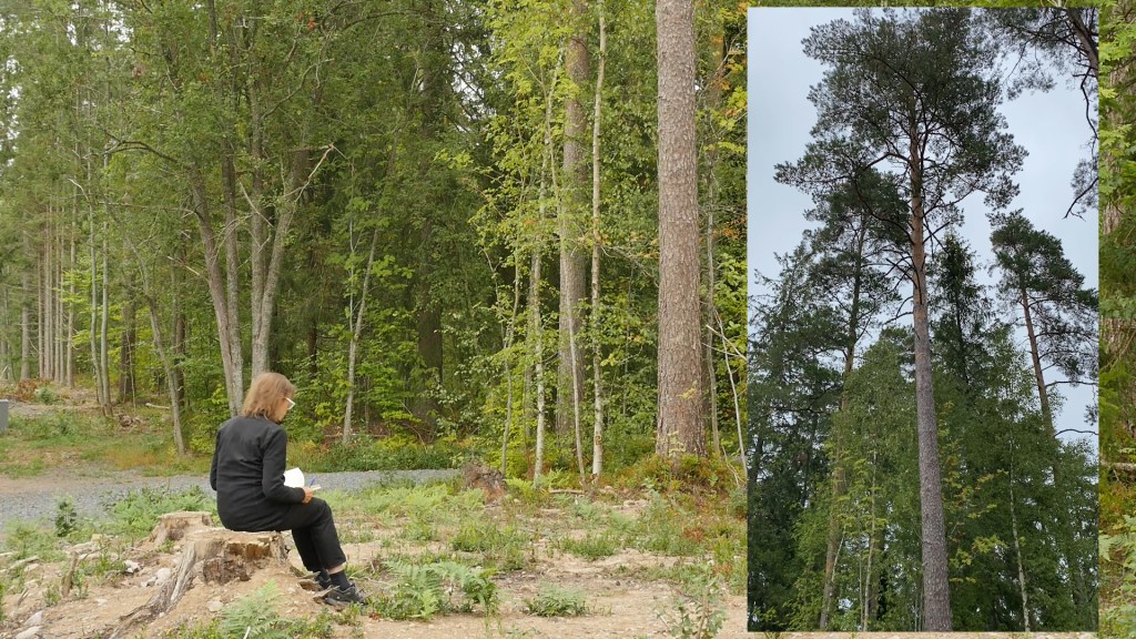 Suunnitelmani oli jättää kävelyt viimeisiksi kokeiluikseni. Pari päivää sitten mietin kuitenkin pitäisikö minun sittenkin kirjoittaa kirje männylle, koska toistaiseksi olin lähestynyt kaikkia mäntyjä puhumalla, ruotsiksi. 25 päivän iltana tein kokeilun järven lähellä kasvavan männyn kanssa ja kirjoitin pienen kirjeen englanniksi. Tein uuden yrityksen ja kirjoitin pidemmän kirjeen samalle männylle 27 päivänä ja lisäsin kirjeet tekstityksenä videoihin. Näyttääkseni jotakin männystä eikä vain minusta istumassa kannolla, upotin kuvan latvuksesta tai puhelimella kuvattua videokuvaa männystä peruskuvaan, käyttäen siten tietyssä mielessä samaa tekniikkaa kuin kävelyiden yhteydessä. Kirjeisiin lopettaminen tuntui asianmukaiselta tavalta päättää oleskeluni, koska sillä tavalla saatoin ilmaista kiitollisuuteni järjestäjille ja myös männyille. Videot löytyvät saman sivun alalaidasta, jolle kaikki kokeiluni Bodaforsissa on dokumentoitu, eli täältä.