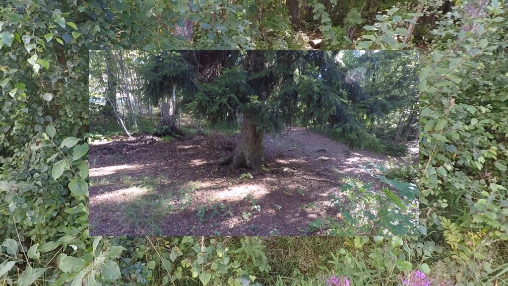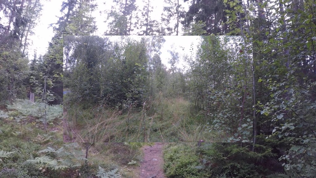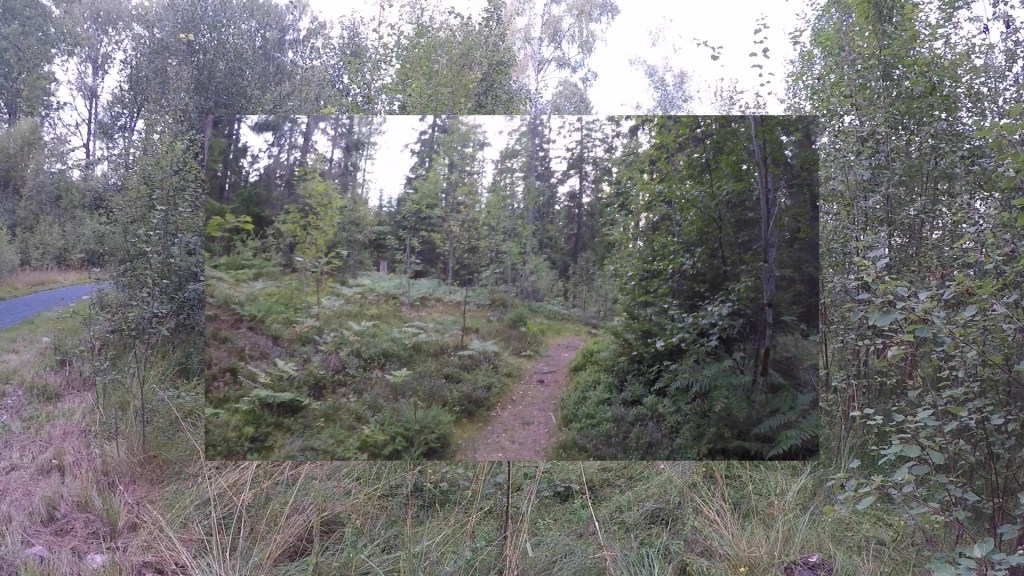 Viimeisenä oleskeluaikanani Bodaforssissa leikin vanhalla GoPro kamerallani, kävellen metsäpoluilla huvilan ympäristössä, jossa asuin. Kamera otsallani kuljin valitsemaani polkua ensin yhteen suuntaan (etelään) ja sitten takaisin (pohjoiseen). Editoidessa upotin pienemmän kuvan paluumatkan kävelystä laajempaan kuvaan (eteläänpäin pohjoiseen kuvaan ja pohjoiseen päin eteläiseen kuvaan) kuten kuvapareista tässä alla voi nähdä. Ensimmäinen pari kuvaa etelään suuntautuneen kävelyn alkua ja loppua, ja toinen pari pohjoiseen suuntautuneen kävelyn alkua ja loppua samalla polulla.