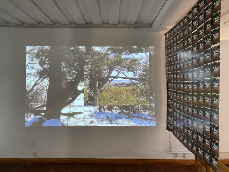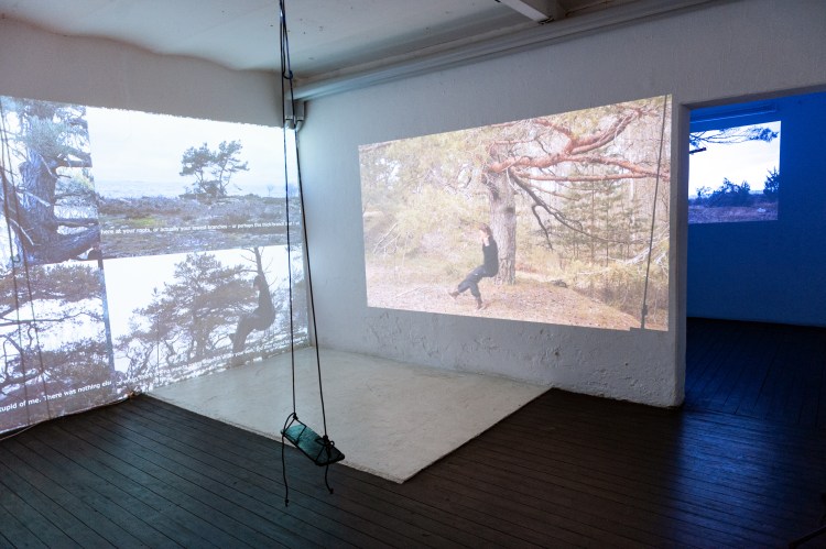 videoteoksia performansseista ja keskusteluista mäntyjen kanssa Lennätingalleria Harakan saarella 12-17.8.2025 klo 12-17